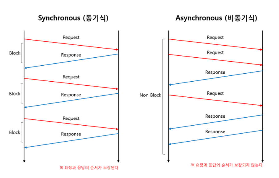 - 동기 통신은 요청을 보낸 후 응답을 받아야지만 다음 작업을 수행한다. 즉, 요청과 응답의 순서를 보장할 수 있다.